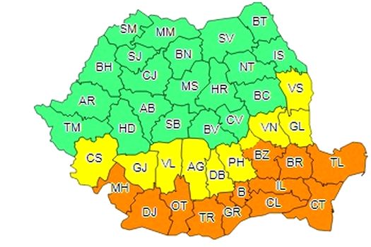 De asemenea, în Municipiul Bucureşti şi în judeţele Giurgiu, Ilfov, Călăraşi, Ialomiţa, Buzău, Brăila, Constanţa şi Tulcea, luni, de la ora 10 până marţi, la ora 14 va fi cod portocaliu de vreme rea.