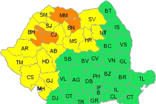 Pe parcursul zilei de sâmbătă şi în noaptea de sâmbătă spre duminică, în judeţul Maramureş şi în zonele de munte ale judeţelor Bistriţa-Năsăud, Bihor, Cluj şi Sălaj se vor acumula cantităţi de apă care vor depăşi local 50 de litri pe metru pătrat şi izolat 70 de litri pe metru pătrat.
