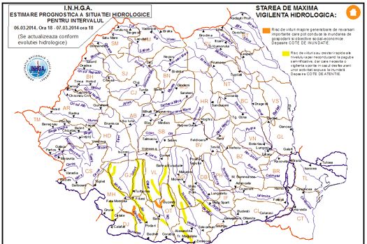 De la ora 21.00, se instituie cod galben pe râurile din bazinele: Vedea (judeţele Olt, Argeş şi Teleorman), Călmăţui (judeţul Teleorman) şi Neajlov (judeţele Dâmboviţa şi Giurgiu), valabil tot până vineri seară.