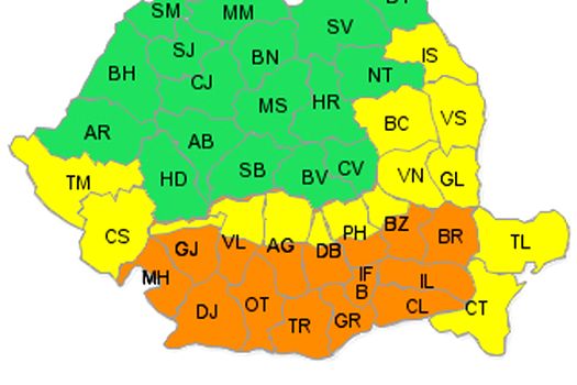 Totodată, 15 judeţe din sudul şi estul ţării vor fi, sâmbătă şi duminică, sub avertizare cod galben de caniculă. În judeţele Timiş, Caraş-Severin, Constanţa, Tulcea, Vrancea, Galaţi, Bacău, Vaslui şi Iaşi, precum şi în unele zone din judeţele Buzău, Prahova, Dâmboviţa, Argeş, Vâlcea şi Gorj, avertizate şi cu cod portocaliu, temperaturile vor fi de 36 – 38 de grade, iar indicele temperatură-umezeală (ITU) va depăşi pragul critic de 80.