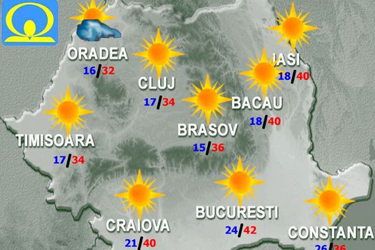 Vremea caniculară va persista în cea mai mare parte a ţării, iar disconfortul termic va fi deosebit de accentuat în regiunile sudice şi estice. Indicele temperatură-umezeală (ITU) va depăşi pragul critic de 80 pe arii extinse în sud şi est, local în centru şi pe arii mai restrânse în rest. Temperaturile maxime vor avea valori de la 30 de grade în Maramureş până la 42 de grade în Câmpia Română. Cerul va fi variabil la senin, cu unele înnorări după-amiaza şi noaptea în regiunile nordice, nord-estice şi la munte, unde vor fi intensificări ale vântului şi izolat averse şi descărcări electrice. Minimele termice vor fi de la 13…14 grade în depresiuni până la 26 … 27 de grade pe litoral şi în deltă.