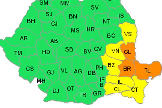 Potrivit avertizării emise de Administraţia Naţională de Meteorologie, în judeţele Brăila şi Tulcea cantităţile de apă vor depăşi local 50 – 60 de litri pe metru pătrat, iar în Galaţi mai sunt posibile cantităţi de apă de 30-40 de litri pe metru pătrat.