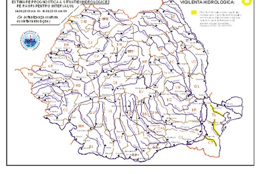 Râuri din 22 de judeţe, majoritatea din jumătatea de est a ţării, au fost de joi până vineri sub cod galben de inundaţii. Codul galben a vizat râurile din bazinele hidrografice Tur (judeţul Satu Mare), Someşul Mare (judeţul Bistriţa-Năsăud), Crasna, Barcău (judeţele Sălaj, Satu Mare, Bihor), afluenţii Oltului superior din judeţul Covasna, afluenţii Oltului inferior din judeţele Gorj, Vâlcea şi Olt, râurile din bazinele hidrografice superioare şi mijlocii ale Vedei, Argeşului, Dâmboviţei, Ialomiţei, Prahovei şi Buzăului (judeţele Olt, Teleorman, Argeş, Dâmboviţa, Prahova, Buzău şi Covasna), râurile mici din bazinele hidrografice Suceava, Moldova, Bistriţa (judeţul Suceava), Putna, Râmnicu Sărat (judeţele Vrancea şi Buzău), Jijia, Bârlad (judeţele Botoşani, Iaşi, Vaslui, Galaţi, Bacău şi Vrancea), afluenţii Prutului din judeţele Vaslui şi Galaţi şi râurile din Dobrogea (judeţele Constanţa şi Tulcea).