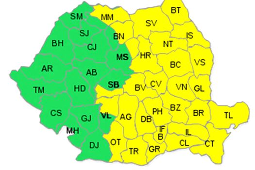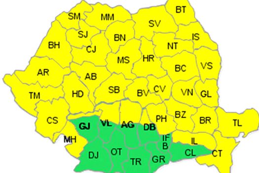 Totodată, duminică, până la ora 20.00 este cod galben de ninsori, ploi abundente, polei şi intensificări de vânt, în aproape toată ţara, cu excepţia Bucureştiului şi judeţelor Călăraşi, Giurgiu, Teleorman, Olt, Dolj, Ilfov, Dâmboviţa, Argeş, Vâlcea şi Gorj.