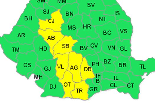 Meteorologii au prelungit codul galben de ploi şi vijelii în judeţele Dâmboviţa, Teleorman, Argeş, Olt, Vâlcea, Sibiu, Alba şi Cluj, unde până marţi seară vor fi ploi torenţiale, descărcări electrice şi intensificări ale vântului care pot lua aspect de vijelie.