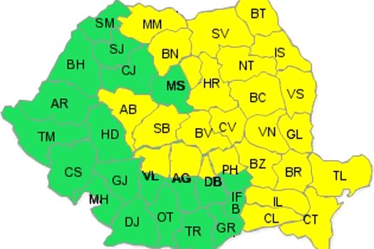 Astfel, rămân sub cod galben, până sâmbătă seară, judeţele Constanţa, Tulcea, Călăraşi, Ialomiţa, Brăila, Buzău, nordul judeţelor Prahova, Dâmboviţa, Argeş şi Vâlcea, Maramureş, Mureş, Bistriţa-Năsăud, Alba, Sibiu, Braşov, Covasna, Vrancea, Galaţi, Harghita, Bacău, Vaslui, Neamţ, Iaşi, Suceava şi Botoşani.