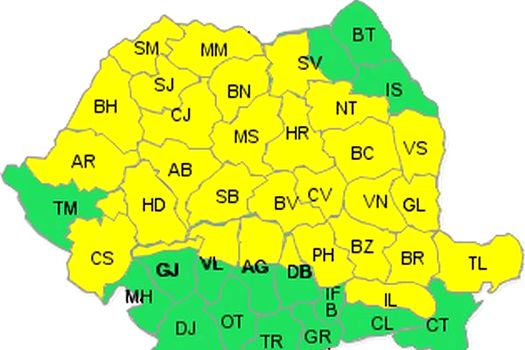 Avertizarea cod galben a fost emisă pentru judeţele Tulcea, Brăila, Ialomiţa, Prahova, Buzău, Vrancea, Galaţi, Vaslui, Bacău, Neamţ, Suceava, Harghita, Covasna, Braşov, Sibiu, Mureş, Bistriţa-Năsăud, Maramureş, Satu Mare, Sălaj, Cluj, Alba, Hunedoara, Bihor, Arad şi Caraş-Severin. Sub avertizare cod galben vor fi şi zone limitate din nordul judeţelor Gorj, Vâlcea, Argeş şi Dâmboviţa şi din estul judeţului Timiş.
