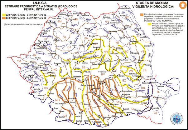 Mureş – bazin superior (judeţele: Harghita şi Mureş), Târnava Mare, Târnava Mică (judeţele: Harghita, Mureş, Sibiu, Alba şi Braşov), afluenţii aferenţi sectorului aval confluenţă Târnava – amonte S.H. Sâvârşin (judeţele: Alba, Sibiu, Hunedoara şi Arad), Timiş – bazin superior amonte S.H. Lugoj (judeţele: Caraş Severin şi Timiş), Cerna (judeţele: Gorj şi Caraş Severin), Drîncea, Desnăţui (judeţele: Mehedinţi şi Dolj), Jiu (judeţele: Hunedoara, Gorj, Mehedinţi şi Dolj), Olt (judeţele: Harghita, Covasna, Braşov, Sibiu, Vâlcea, Argeş, Olt, Gorj şi Dolj), Călmăţui, Vedea (judeţele: Argeş, Olt şi Teleorman), Argeş (judeţele: Argeş, Dâmboviţa, Giurgiu, Teleorman, Ilfov şi Călăraşi), Ialomiţa (judeţele: Dâmboviţa, Prahova, Ilfov, Buzău şi Ialomiţa), Buzău – bazin superior şi mijlociu şi afluenţi (judeţele: Braşov, Covasna şi Buzău), Trotuş (judeţele: Harghita, Neamţ, Bacău şi Covasna), Putna (judeţul Vrancea), Rm. Sărat (judeţele: Buzău şi Vrancea), Bârlad (judeţele: Neamţ, Iaşi, Vaslui, Bacău, Vrancea şi Galaţi), transmite INHGA.