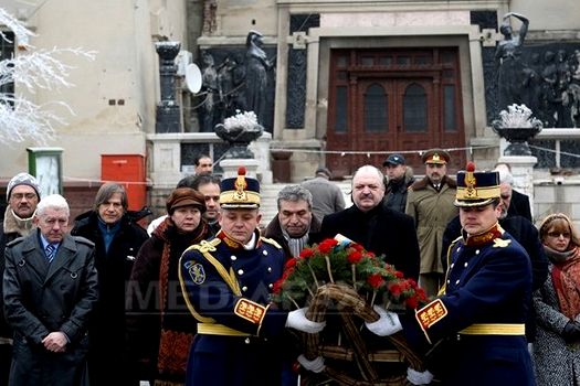 În jurul orei 12.30, ceremoniile s-au mutat la troiţa din Piaţa Universităţii, unde circulaţia a fost restricţionată temporar pe bulevardul Nicolae Bălcescu, sensul spre Piaţa Romană. La eveniment au participat militari din Regimentul 30 Gardă „Mihai Viteazul” şi aproximativ 100 de persoane, între care şi un grup de revoluţionari, cu două bannere. Pe unul dintre acestea era scris mesajul „Nu mistificaţi isoria recentă, domnilor istorici. Întrebaţi-l pe Iliescu cine a deturnat Revoluţia din decembrie 1989, cine sunt vinovaţii pentru victime, cine sunt vinovaţii pentru mineriade, când se vor repara prejudiciile. Vrem adevărul. Semnat: Un supravieţuitor”, iar prin celălalt banner se cerea „lustrarea clasei politice instalate după ’89”.