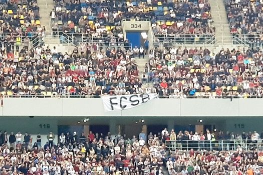 Astfel, după cum se poate observa în poza de mai jos, în prima repriză la inelul superior de la tribuna a doua, mai mulţi suporteri FCSB au încercat să afişeze un banner cu mesajul FCSB = Steaua. Suporterii Peluzei SUD Steaua au anticipat o astfel de replică după mesajul pe care ei l-au afişat la jocul FCSB – CSU Craiova, astfel că încercarea fecesebiştilor a fost dejucată rapid. Pe gard a apucat să apară doar partea bannerului pe care scria ”FCSB”, restul mesajului fiind blocat de intervenţia steliştilor. Pânza a fost confiscată şi dusă în Peluza SUD, însă până la lămurirea incidentului, mai mulţi suporteri şi-au părăsit locul şi s-au îndreptat, în viteză, către sectorul în care suporterii FCSB au încercat afişarea mesajului.