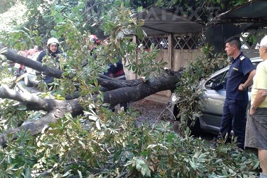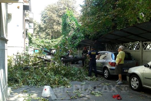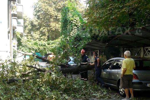 Un copac a căzut, joi, pe un autoturism, în sectorul 2 al Capitalei, la faţa locului sosind o autoutilitară a pompierilor.