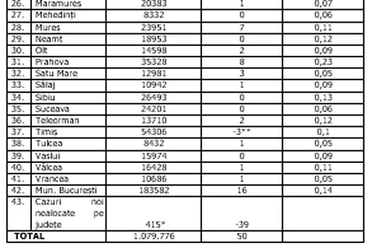 În urma testelor efectuate la nivel naţional, faţă de ultima raportare, au fost înregistrate 50 cazuri noi de persoane infectate cu SARS – CoV – 2 (COVID – 19).
