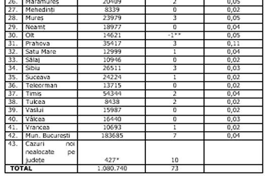 În urma testelor efectuate la nivel naţional, faţă de ultima raportare, au fost înregistrate 73 cazuri noi de persoane infectate cu SARS – CoV – 2 (COVID – 19).