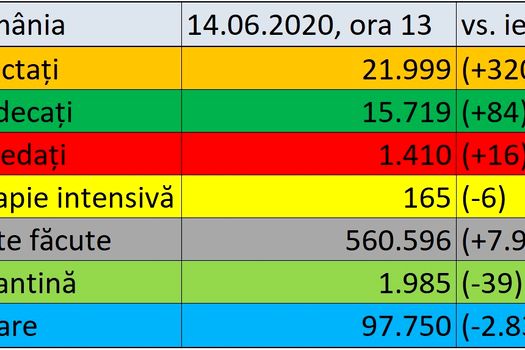 În intervalul 13.06.2020 (10:00) – 14.06.2020 (10:00) au fost înregistrate 16 decese (9 bărbaţi şi 7 femei), ale unor pacienţi infectaţi cu noul coronavirus, internaţi în spitalele din Argeş, Bacău, Botoşani, Braşov, Călăraşi, Cluj, Iaşi, Olt, Sibiu şi Suceava.