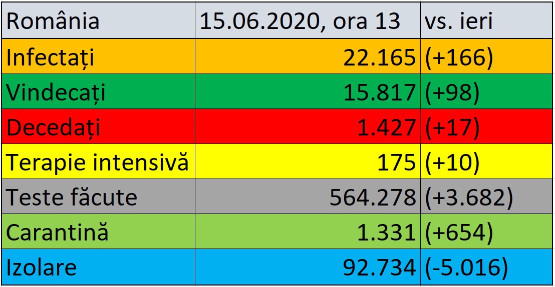 Până astăzi, 15 iunie, pe teritoriul României, au fost confirmate 22.165 de cazuri de persoane infectate cu virusul COVID – 19 (coronavirus). Dintre persoanele confirmate pozitiv, 15.817 au fost declarate vindecate şi externate. Până astăzi, 1427 persoane diagnosticate cu infecţie cu COVID-19 au decedat.
