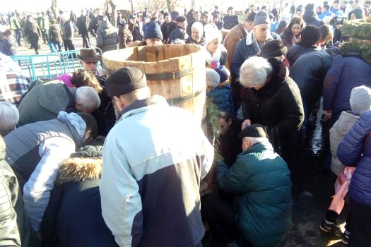 Credincioşii au luat Agheasmă Mare din butoaie din lemn, împodobite cu cetină de brad şi panglici tricolore.