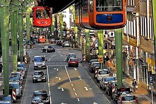 Sistem unic într-un orăşel din Germania. Din cauza râurilor şerpuite, căile ferate tradiţionale ar fi imposibil de construit.