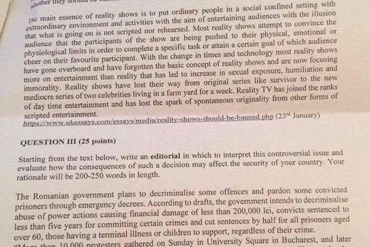 Textul la care cerinţa face referire este un articol apărut în coditianul britanic The Guradian care explica criza politică şi protestele din România în urma Ordonanţei 13. Asociaţiile de părinţi s-au arătat nemulţumite de subiectele primite de elevi.