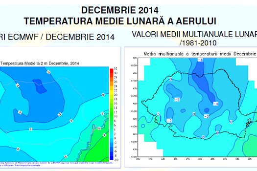 Temperatura medie lunară a aerului va înregistra valori sub mediile climatologice în zonele nordice şi centrale, local în sud-estul ţării valorile termice vor fi mai ridicate decât mediile, iar în restul regiunilor, normale.