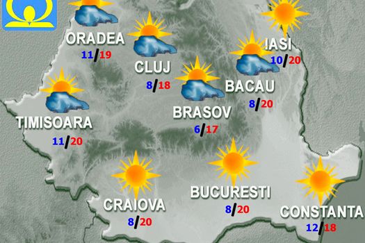 În vestul, nordul şi în centrul ţării vor fi înnorări temporare şi pe arii relativ extinse va ploua. În restul teritoriului, vremea va fi predominant frumoasă, cu cer variabil, iar ploi slabe, izolate se vor semnala în cursul nopţii. Vântul va sufla slab şi moderat, cu unele intensificări pe crestele montane. Temperaturile maxime, în scădere faţă de ziua anterioară în regiunile nordice şi de nord-est, vor fi cuprinse între 13 grade în nordul Moldovei şi 23…24 de grade în Oltenia şi Muntenia, iar cele minime se vor încadra între 4 şi 13 grade. Dimineaţa, în zonele joase de relief, izolat se va semnala ceaţă.