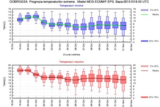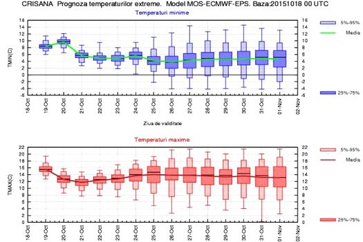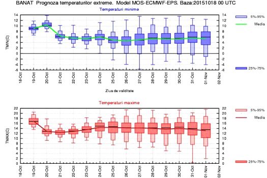 Primele zile vor fi caracterizate de o vreme mai caldă decât în mod obişnuit în această perioadă a anului, cu temperaturi maxime de aproximativ 19 grade şi minime de 12…13 grade, în medie regională. Începând din data de 21 octombrie, vremea se va răci, iar regimul termic va reveni la normal, urmând a se înregistra valori medii de 12…14 grade ziua şi 6…8 grade noaptea, ce se vor menţine, cu mici variaţii, până spre sfârşitul celor două săptămâni de prognoză.