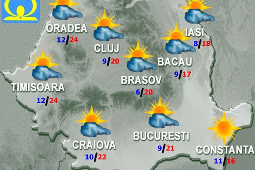 Temperaturile maxime vor fi de la 15…16 grade pe litoral până la 25…26 de grade în Dealurile de Vest, iar cele minime între 6 şi 15 grade, mai coborâte în depresiunile intramontane, până la 2…4 grade. Se va semnala ceaţă, în orele dimineţii pe arii restrânse, în special în zonele depresionare din centrul ţării, iar noaptea cu caracter local, mai ales în sud şi în est, unde poate fi asociată cu burniţă.