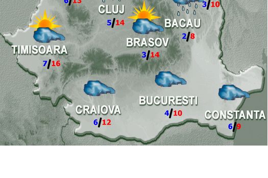 Temperaturile maxime, în uşoară scădere faţă de ziua anterioară, vor avea valori de la 7 grade în Moldova până la 18 grade în Dealurile de Vest, iar cele minime se vor încadra între -1 şi 9 grade. Pe arii restrânse în zonele joase va fi ceaţă.