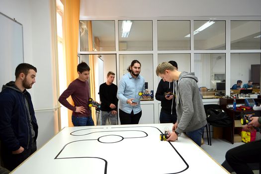 „Am grupat studenţii în şase echipe, am pus materialele la dispoziţie, urmând să construiască o platformă ce trebuia prezentată într-un raport, dar şi într-o competiţie internă în cadrul grupei respectivă care a constat în două probe: urmărirea unei linii tip traseu viteză şi un traseu de obstacole. Obstacolele au constat în intersecţii, un sens giratoriu, întreruperea liniei de deplasare pe o distanţă mare, dar care aveau în dreapta sau în stânga un perete ca robotul să poată urmări, folosind un senzor cu ultrasunete, spre exemplu, un perete acolo unde linia se întrerupe”, a povestit profesorul Ioan Doroftei.