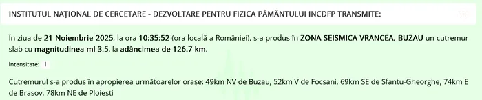 Potrivit Institutului Naţional de Cercetare-Dezvoltare pentru Fizica Pământului, cutremurul a avut loc vineri, la ora 10.35 în zona seismică Vrancea, județul Buzău.