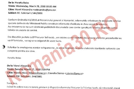 Adresa internă a Direcţiei Naţionale Anticorupţie (DNA) menţionează Ordinul 43/2018 al procurorului general privind informaţiile referitoare la mijloacele tehnice speciale deţinute de Ministerul Public ce constituie informaţie clasificată în clasa secret de serviciu. În cadrul acestui email intern, Horaţiu Baias, şeful Serviciului Tehnic al DNA subliniază că echipamentele tehnice nu sunt omologate.
