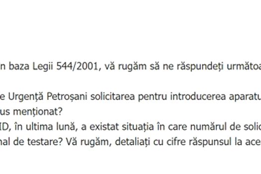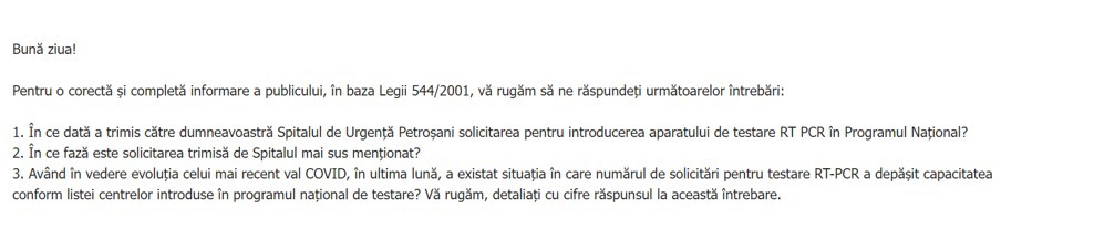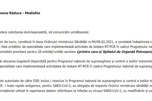 “Grupul tehnic de lucru, constituit în baza Ordinului ministrului Sănătăţii nr.94/08.02.2021, a constatat îndeplinirea criteriilor de evaluare în vederea includerii în lista unităţilor de specialitate care implementează activitate de testare RT-PCR în cadrul Programului naţional de supraveghere şi control a bolilor transmisibile prioritare pentru 28 entităţi/unităţi sanitare (printre care şi Spitalul de Urgenţă Petroşani, Hunedoara).” – Sursa: Răspuns al Ministerului Sănătăţii pentru Mediafax