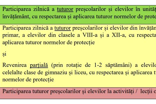 Cele trei scenarii sunt: roşu, galben şi verde, în funcţie de situaţia epidemiologică. Cele trei mari scenarii sunt stabilite în funcţie de numărul de cazuri noi din ultimele 14 zile la mia de locuitori. Anul şcolar 2020-2021 începe pe 14 septembrie.