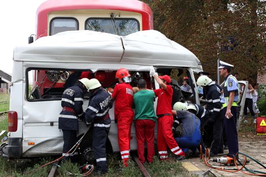 Microbuzul implicat în accident, în care se aflau 16 persoane, a fost lovit de un tren la o trecere de cale ferată în apropierea localităţii ieşene Scânteia.