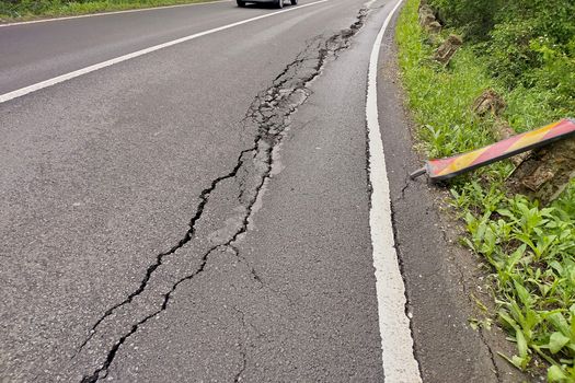 În imaginile publicate se vede cum carosabilul este surpat, pe alocuri, în mijlocul benzii de circulație, iar acostamentul care a alunecat, cortina de asfalt fiind prăbușită pe alocuri.