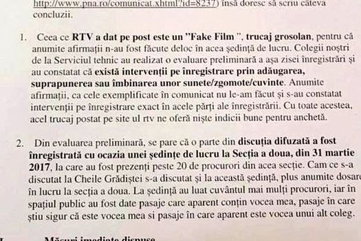 „Trebuie să răspundă în faţa legii cel/cea care a înregistrat ilegal şi a dat public înregistrările cu şedinţa de lucru internă a DNA. (spun cel/cea pentru că cercul limitat de suspecţi are şi ‘ea’ şi ‘el’, dar îi voi numi de acum încolo ‘infractor’ – făra gen – pentru că asta este). În acest moment avem conturat un cerc de suspecti si vom afla cine este vinovat de aceasta fapta”, este un pasaj din e-mailul prezentat de România Tv.