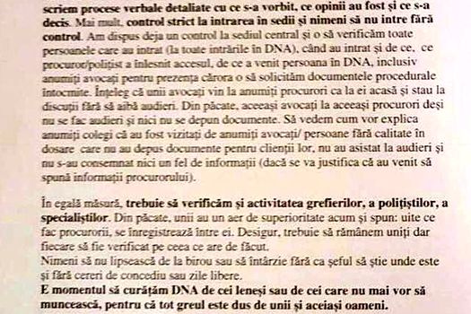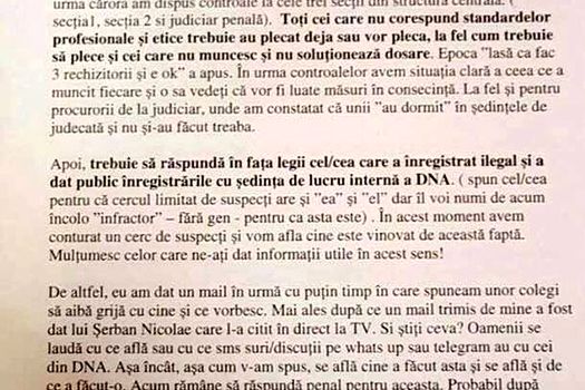 „Probabil după mail-ul meu cel/cea care furniza toate bîrfele unor persoane din afara DNA a stat cuminte câteva zile spunându-şi că, dacă nu i s-a spus nimic probabil nu se ştie. Nu! Va răspunde penal pentru furnizarea unor informaţii, aşa cum va răspunde şi pentru înregistrarea ilegală care a furnizat-o în afara DNA. Cum spuneam…lumea e mică şi aşa ceva se află mereu! (..)E momentul să fim uniţi şi să arătăm oamenilor că DNA înseamnă tot ceea ce era în ianuarie când au ieşit în stradă să ne susţină. Că DNA nu este un infractor laş care înregistrează ilegal. Că DNA sunt acei oameni care fac zilnic dosare şi se implica”, se mai arată în document.