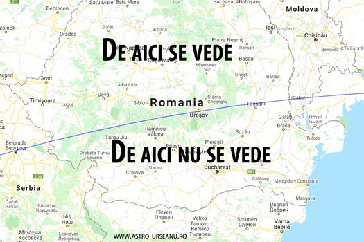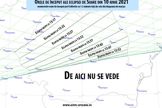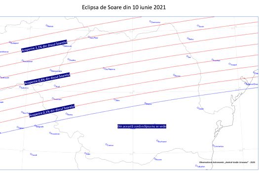 Eclipsa de Soare de joi, 10 iunie, se va vedea ca parţială din jumătatea de nord a României. Aceasta va fi vizibilă iniţial din judeţele Bihor şi Satu Mare, iar apoi şi din Banat, Transilvania şi Moldova.