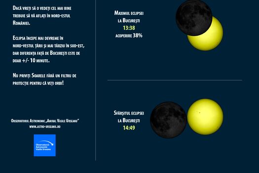 La Bucureşti, eclipsa începe la ora 12.26 şi se va termina la ora 14.49.
