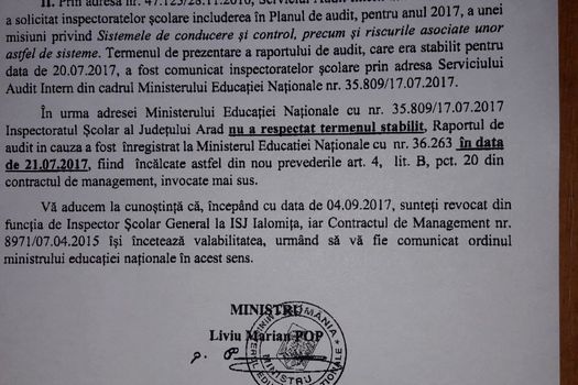 „În urma adresei Ministerului Educaţiei Naţionale, Inspectoratul Şcolar al Judeţului Arad nu a respectat termenul stabilit, raportul de audit în cauză a fost înregistrat la MEN în data de 21 iulie 2017, fiind încălcate astfel din nou preverderile articolului 4 lit B pct 20, din Contractul de Management”, conform documentului citat.