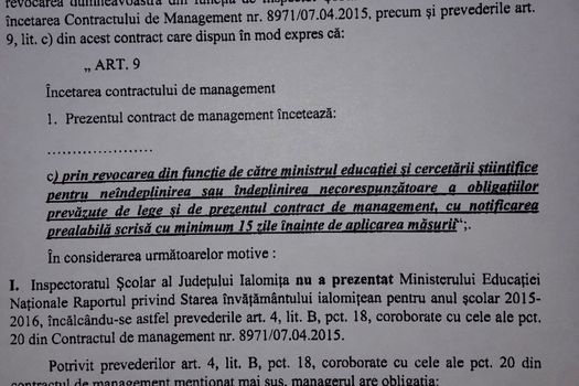 Demiterea din Ialomiţa s-a făcut în baza unei note transmise de MEN, prin care se arată că inspectorul şcolar general al ISJ Ialomiţa a fost revocat din funcţie pentru că nu a prezentat ministerului Raportul privind starea învăţământului ialomiţean, pentru anul 2015-2016.