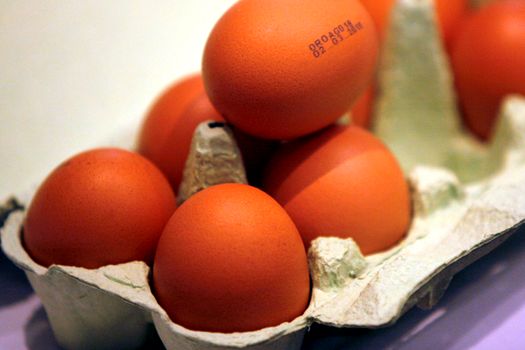 Oua marcate sunt asezate pe masa, in timpul conferintei de presa „Stampila de pe ou”, eveniment ce marcheaza inceputul campaniei cu acelasi nume pornita de organizatia pentru protectia animalelor „Vier Pfoten”, in Bucuresti, marti, 9 februarie.