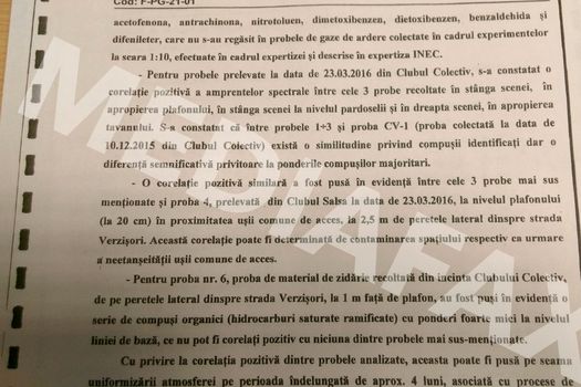 Pe 23 martie criminaliştii au ridicat noi probe atât din clubul Colectiv, cât şi din clubul Salsa, situat alături, se arată în raport. La testele făcute pe aceste probe s-au găsit substanţe toxice care nu au fost depistate la expertize.