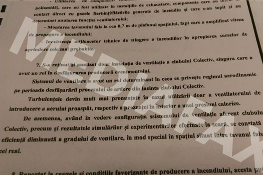 „Sistemul de ventilaţie a avut un rol determinant în ceea ce priveşte regimul aerodinamic pe perioada desfăşurării procesului de ardere din incinta clubului Colectiv. Turbulenţele devin mult mai pronunţate în cazul utilizării doar a ventilatorului de introducere a aerului proaspăt, respectiv a prezenţei în interior a unei presiuni calorice”, notează experţii.