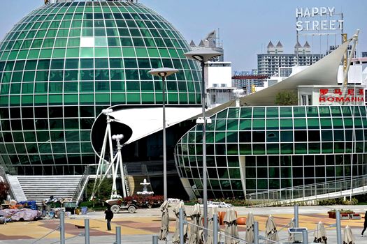 Pavilionul naţional al României, o construcţie în formă de măr, cuprinde săli de expoziţie, ecrane multimedia, o sală de conferinţe, o scenă care va găzdui spectacole live şi un restaurant cu specific românesc.