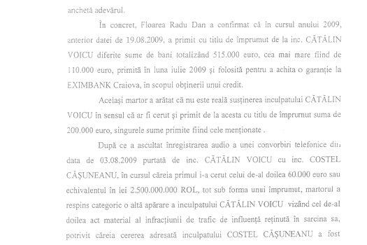 „Fiind audiat la data de 19 aprilie 2010, martorul Radu Dan Floarea a recunoscut faptul că inculpatul Cătălin Voicu a încercat să-l determine să dea o declaraţie neconformă realităţii, în sensul că ar fi primit de la el, cu titlu de împrumut, suma de 200.000 de euro provenind de la inculpatul Costel Căşuneanu, cu termen de restituire sfârşitul anului 2009”, se arată în rechizitoriul întocmit de procurorii DNA la finalul anchetei în cazul senatorului Voicu, document obţinut de MEDIAFAX.