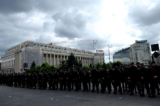 După mai bine de o oră de protest, mai mulţi poliţişti se îndreptau hotărâţi spre scenă, croindu-şi loc prin mulţime cu scuturile de carton. Au vrut să ajungă în prima linie, umăr la umăr cu jandarmii, mai ales că un protestatar neangajat reuşise să aprindă o fumigenă.