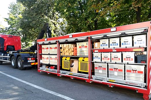 În container sunt materiale şi echipamente pentru executarea intervenţiilor la clădiri avariate fie de explozie, fie de cutremur, sunt şi toate dotările pentru alpinişti, grupuri electrogene pentru iluminat sau echipamente pentru spart beton.