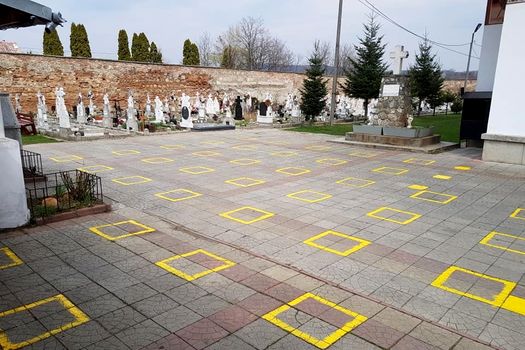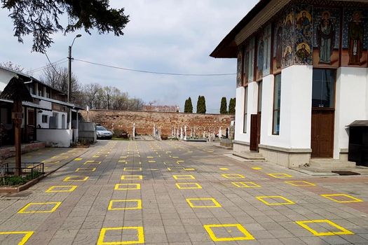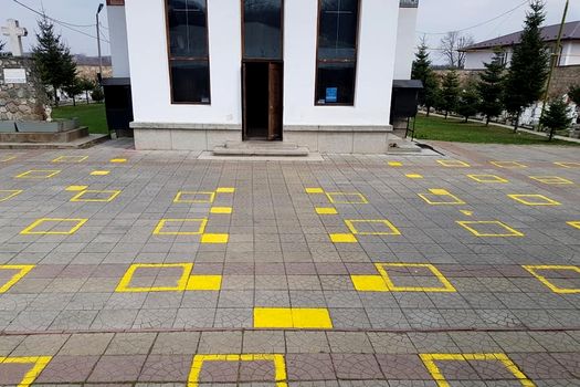 Astfel, în curtea lăcaşului de cult au fost trasate pătrăţele care reprezintă câte un loc pentru fiecare enoriaş, la distanţă legală de 1 metru.