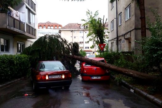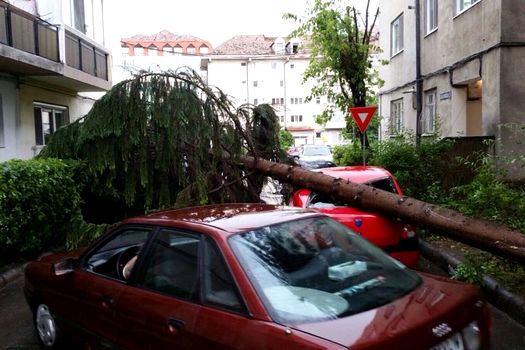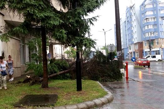 Conform reprezentanţilor CJSUBN, probleme au existat din cauza furtunii şi în municipiul Bistriţa, unde un copac a căzut pe trotuar şi un altul s-a rupt şi a căzut peste o maşină parcată.