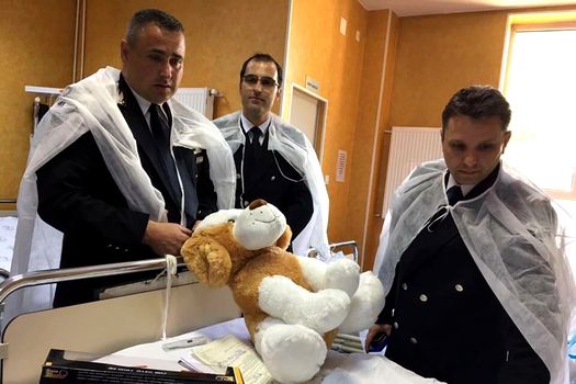 Salvatorii i-au adus în dar lui Dănuţ, copilul de un an şi nouă luni pe care l-au salvat dintr-o fântână din judeţul Teleorman şi care este internat la Spitalul Grigore Alexandrescu, o jucărie, un animal de pluş.